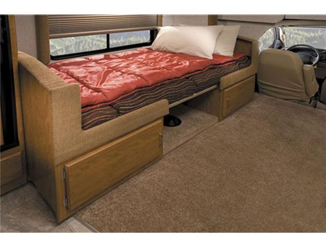 Ideal for four adults and one child. The single slide-out design offers a spacious living area and a large exterior storage bay. Powered by a Ford/Chevy (6.8/6.0 liters) gasoline engine, 5 Speed Overdrive Automatic Transmission with Cruise Control. AM/FM Radio – CD player, In-dash airconditioning in the drivers cab and living area. Power generator, range (stove), microwave, refrigerator, and a sink, shower & toilet. Cab-over Bed that can accommodate 2 persons, the Dinette can be converted into a single bed, and a permanent Bed located at the back of the vehicle.